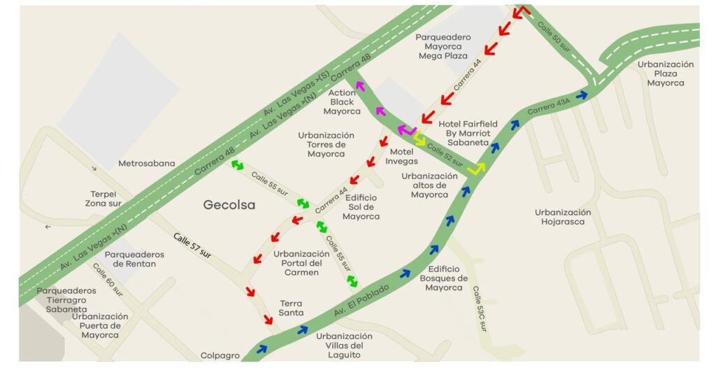 - La carrera 44 quedará en sentido norte – sur, entre las calles 52 sur y 57 sur. Esta vía se convierte en acceso principal a Sabaneta desde la calle 52 sur, reemplazando el acceso habitual por la carrera 43A.